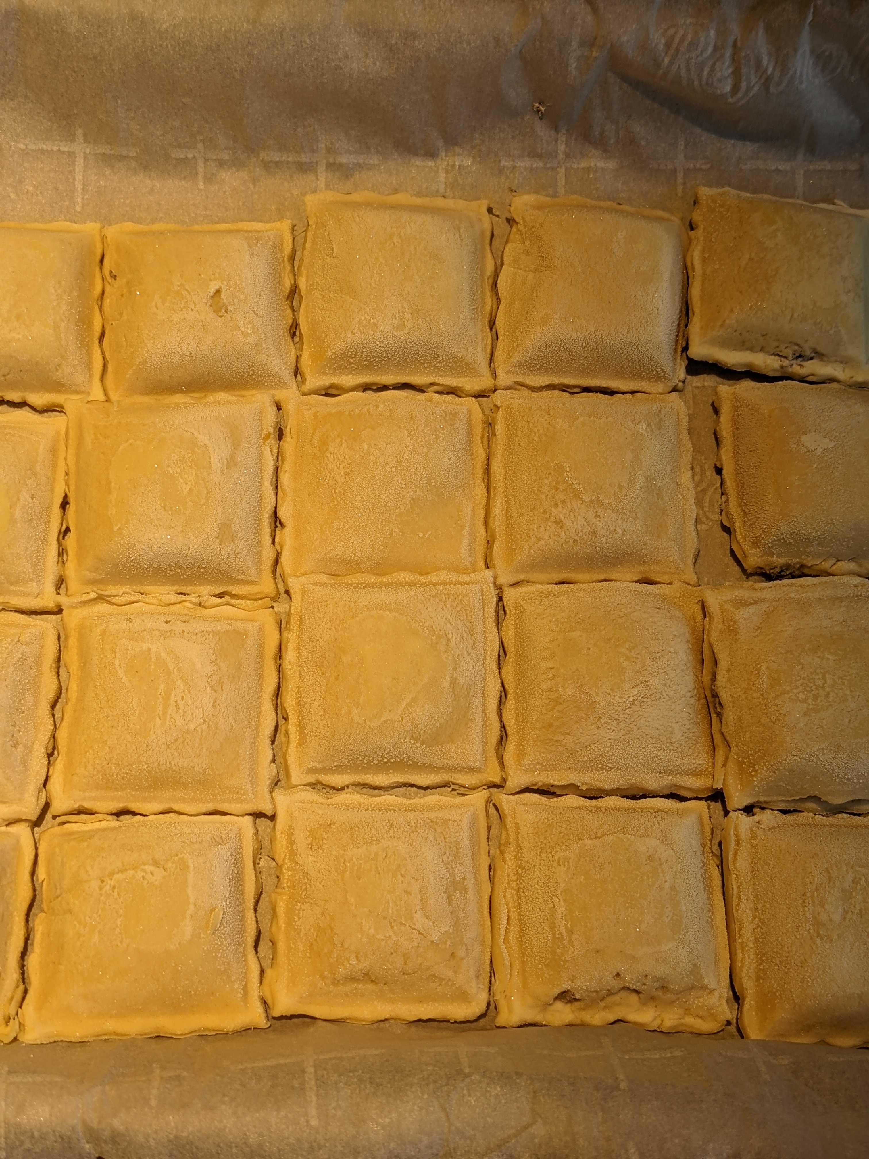 To make the ravioli, use the recipe for the Pasta Dough (which you can easily access by clicking on that recipe title). Roll out the dough through the widest setting on your pasta machine, and then reduce the thickness several levels. Once you have the desired thickness, spray a ravioli tray lightly with the cooking oil, and place the dough over top of the tray. Place a spoon full of the cooled mushroom mixture into each ravioli square, and then lay a piece of the pasta dough on top of the ravioli tray and use a rolling pin to close/seal each piece of the ravioli. Remove the ravioli from the trays, place them on sheets of parchment paper, place them carefully in a plastic freezer bag, and put them into the freezer.