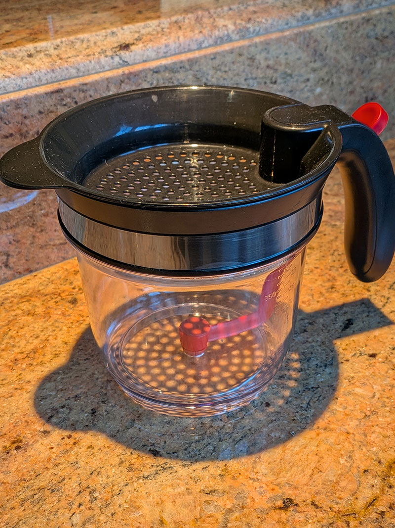 Drippings of a Whole, Roasted Turkey separated from the grease, and add the carrots/celery/onions from the roasting pan (it is suggested to have a device that helps with this process, as shown here:)